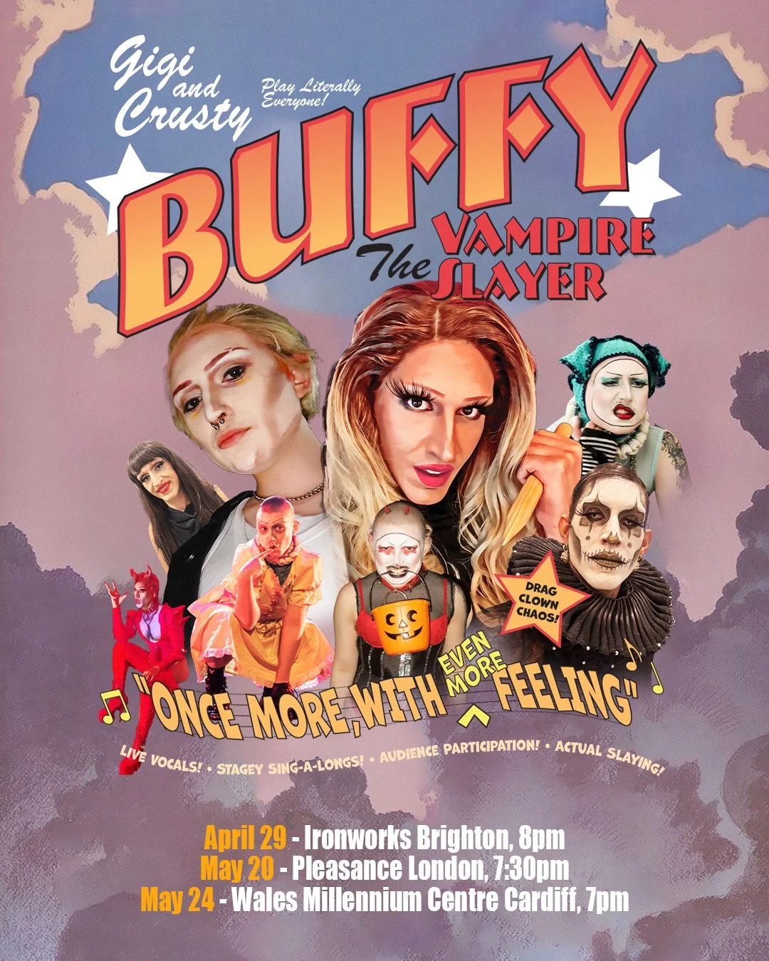 After 3 sold out years at The Glory, The Divine and The Pleasance, Gigi and Crusty are preparing to tour their chaotic Buffy the Vampire Slayer sing-a-long cabaret around the UK! Click below for ticket links: